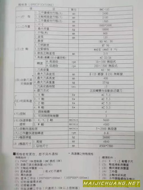 台湾远东数控镗铣床BMC-135,远东130,BT50主轴带齿轮箱,千分之一度,工作台mm,承重10000KG,X轴行程2400mm,Y轴行程2100mm,Z轴行程1500mm,W轴行程900mm,60把刀库,发那科系统,三轴硬轨,三轴带光栅尺。 信息编号:S602423 |