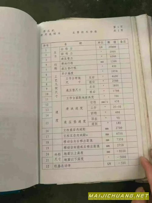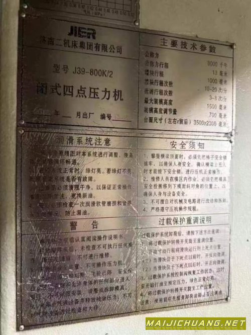 合肥锻压2000吨滑块行程:1500mm开口高.